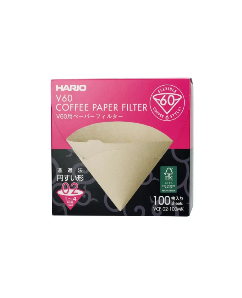 100 Hario V60-02 filters designed for conical coffee drippers. This is the version of brown filters – made from 100% unbleached paper pulp, providing great water flow and not compromising the flavour of the brew.